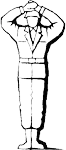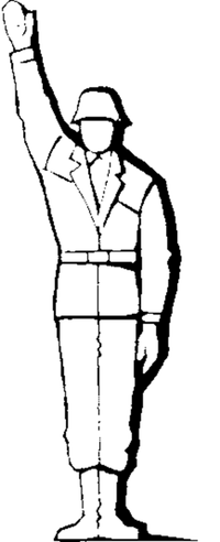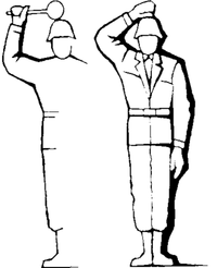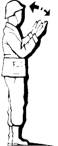 ![]() | AchtungAchtung! Ankündigung, Verbindungsaufnahme, Verstanden!, Fertig!Arm ausgestreckt senkrecht hochhalten |