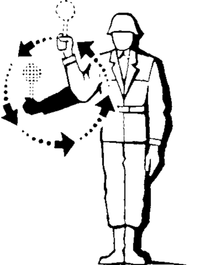 ![]() | Arbeit aufnehmenAnfangen! Arbeit aufnehmen! Motor anlassen!Drehbewegung mit dem Arm (Winkerkelle) seitlich des Körpers |