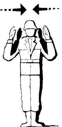 ![]() | VorwärtsLangsam vorwärts fahren!Beide Hände mit Handflächen zum Körper, in Schulterhöhe halten, zum Körper hin winken |