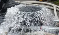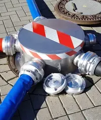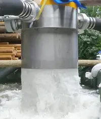 Umgedreht eingesetzt dient die SET als freier Auslauf: Sie nimmt mehrere Schlauchleitungen auf, bricht den Strahl und schützt Ufer oder Untergründe vor Ausspülungen. Eine Auslaufplane von mindestens 4x4 Metern verhindert zusätzlich das Durchweichen des Bodens, während schwere Partikel in der SET zurückbleiben.